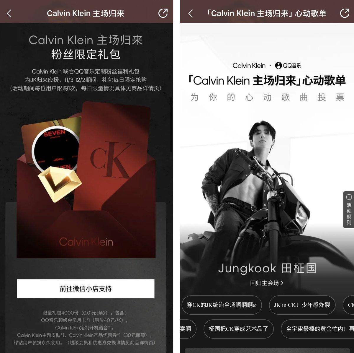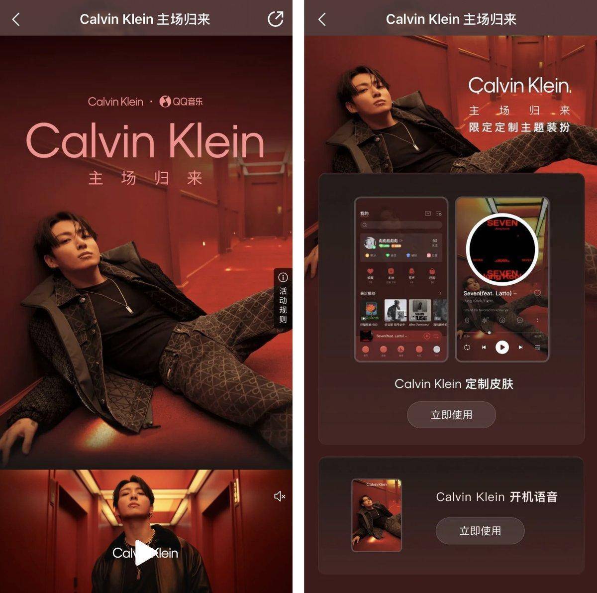 近日,QQ音乐与全球知名品牌Calvin Klein(以下简称为CK)合作,发起田柾国回归粉丝应援活动。不仅推出田柾国限时装扮、应援互动活动,还特别推出粉丝限定礼包,为粉丝带来独具收藏价值的数字体验。这一跨界合作将音乐与时尚跨界融合,活动一上线便引发互动和抢购热潮。